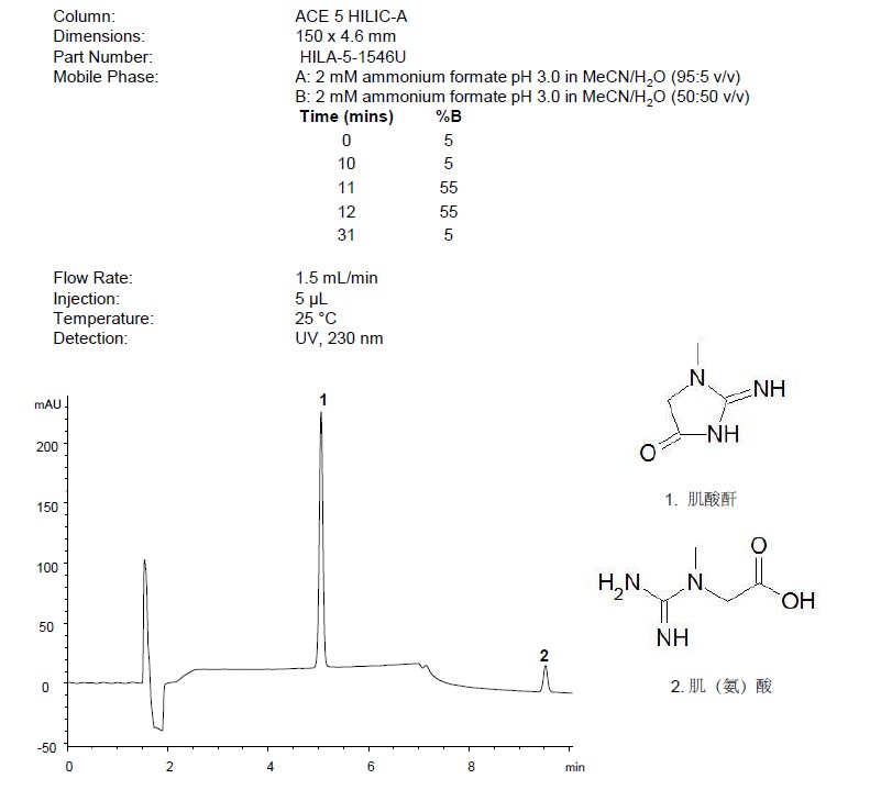 針對(duì)不同酸堿性的化合物,ACE設(shè)計(jì)了三款HILIC柱(A,B和N),實(shí)現(xiàn)不同的選擇性。比如: