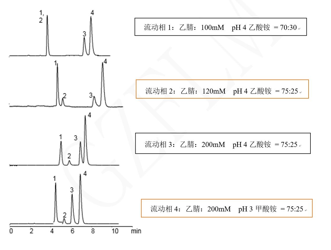 說(shuō)明:本案例中乙腈比例及緩沖鹽種類(lèi)和強(qiáng)度的變化帶來(lái)磷霉素與庶糖的0分離到完全分離的變化, 以及保留時(shí)間上的變化。