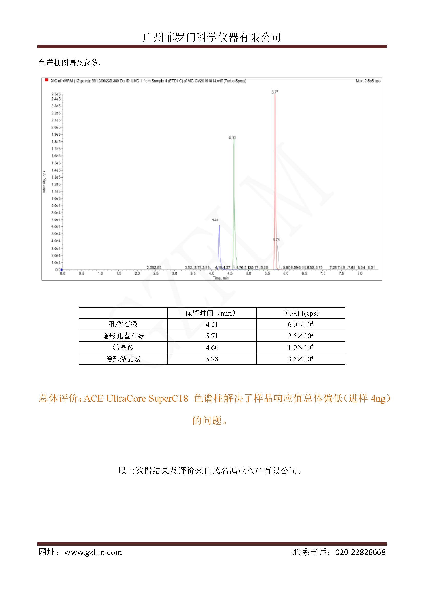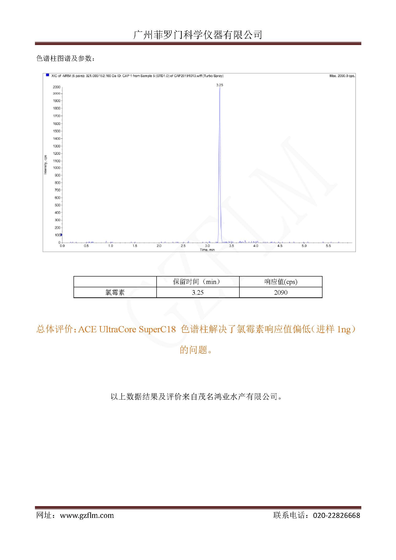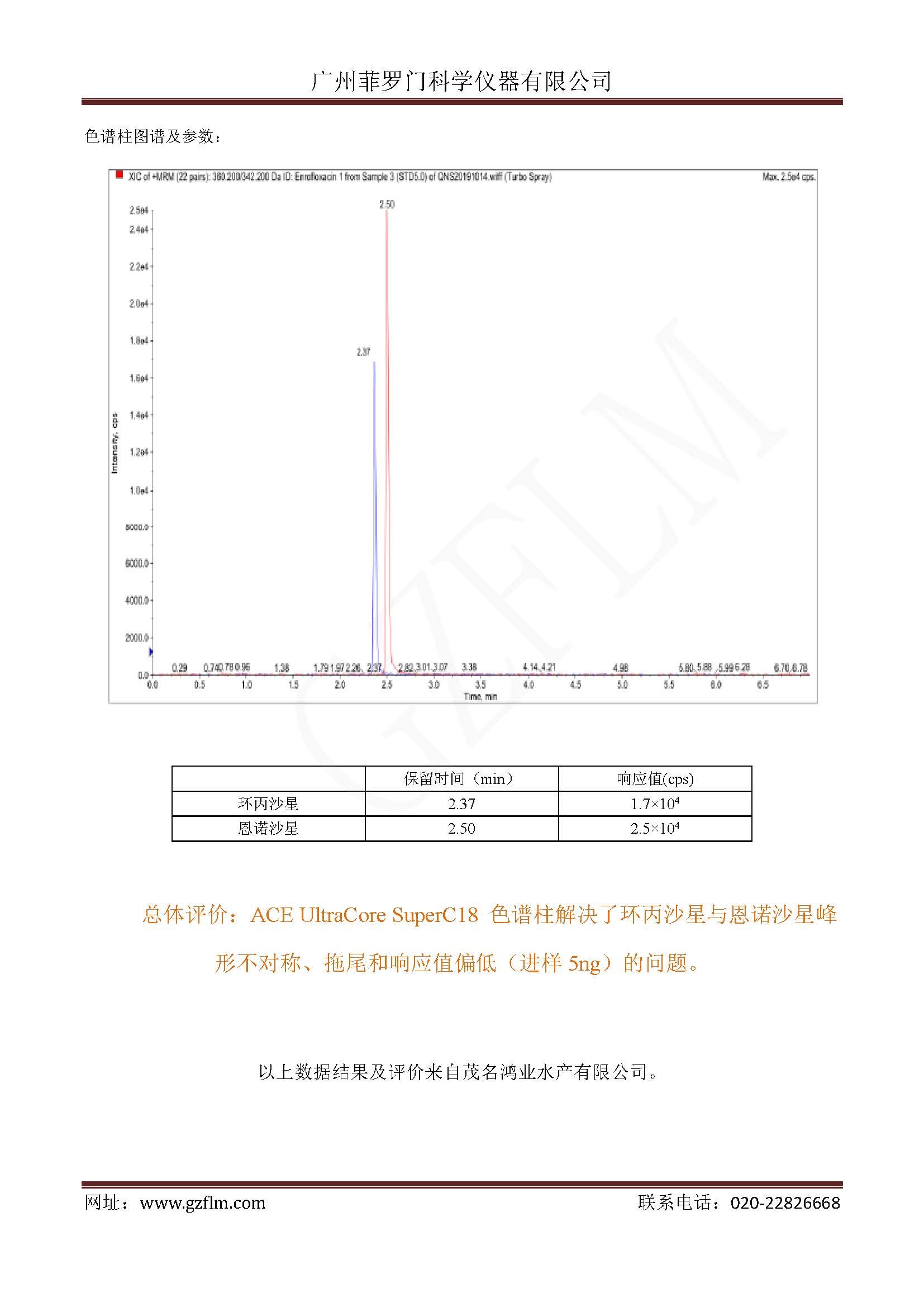 以上由ACE UltraCore Super C18 2.5u 50 X 3.0mm (貨號:CORE-25A-0503U)一根柱子在質譜上解決硝基呋喃類、氯霉素類、磺胺類、沙星類、孔雀石綠和結晶紫水產品中的藥物殘留。