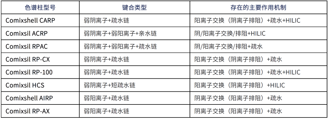 2021年,我們?cè)诨旌献饔茫?/span>mixed-mode)固定相設(shè)計(jì)上繼續(xù)開(kāi)疆拓土,開(kāi)發(fā)出了Comixsep系列的三款多種作用力組合的反相固定相;
