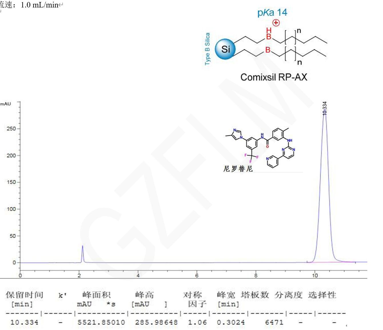方法說明:尼羅替尼具有多個堿性基團(tuán),在 C18 柱上會出現(xiàn)明顯拖尾效應(yīng);而使用 Comixsil RP-AX 是陰離子交換+疏水混合模式,對化合物上堿性基團(tuán)是排斥作用,可以達(dá)到改善峰型的效果。