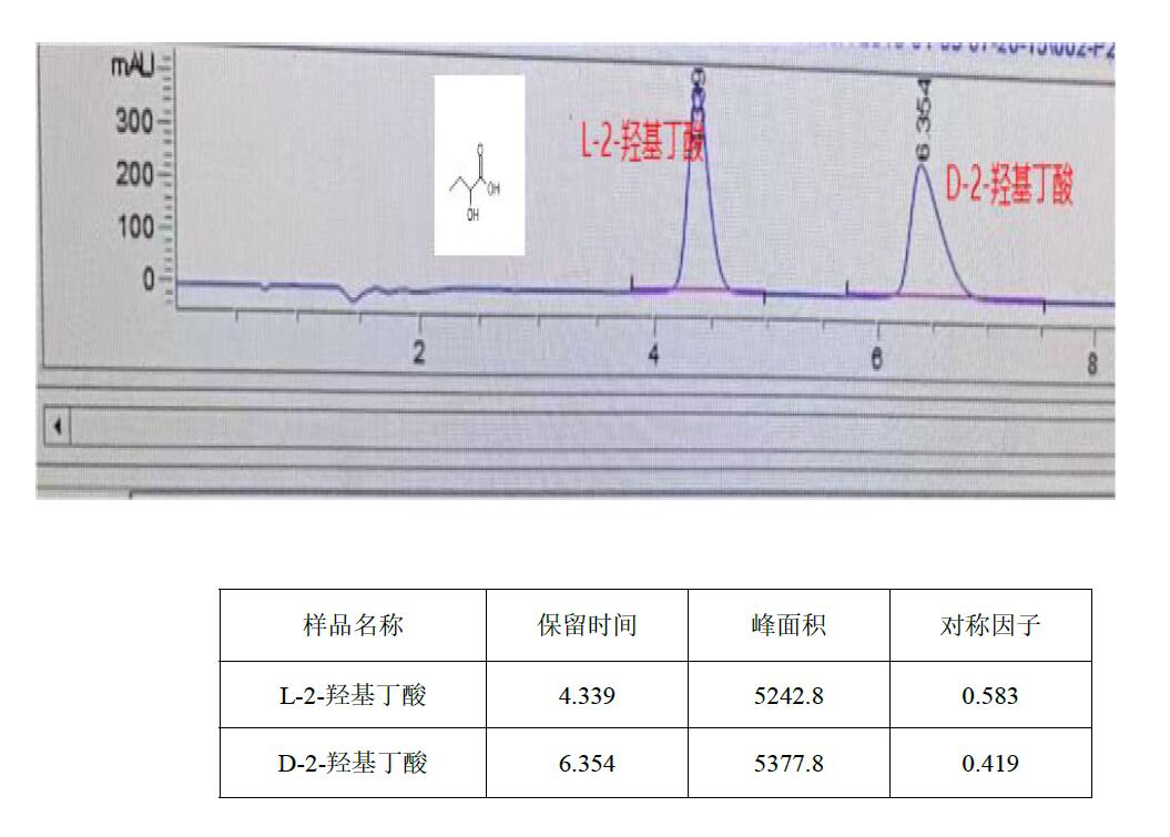 App ID: FLM-B250018 D, L-2-羥基丁酸手性拆分 色譜柱:Chiral AAOA 3μ 50×4.6mm (FMB-AAOA3-EONU) 流動相:2mM CUSO4 水溶液:異丙醇=95:5 流速:1 mL/min 波長:230nm 溫度:25℃ ![]() |