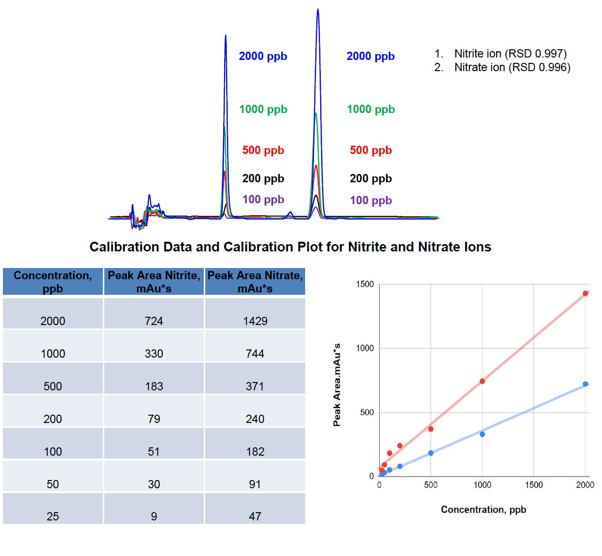 方法說明:某藥物中亞硝酸根與硝酸根殘留量的檢測。我們獲準(zhǔn)公布與分享這兩個離子的線性數(shù)據(jù)。 Comixsil HAX是陰離子交換+Hilic的混合模式色譜柱。此案例中將進樣量提升至100ul將再升LOD/LOQ 。ACN可以用于去除分析中其它非離子的不希望要的化合物的干擾(Hilic下不保留)。同時如果樣品中有其它堿性化合物,基于陽離子排阻,將很快洗脫出峰不干擾。 |