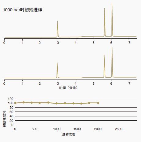 將2.1×100mm ACE Excel C18 UHPLC色譜柱在平均1,000 bar(14,500 psi)壓力下進行2000多個梯度的運行。