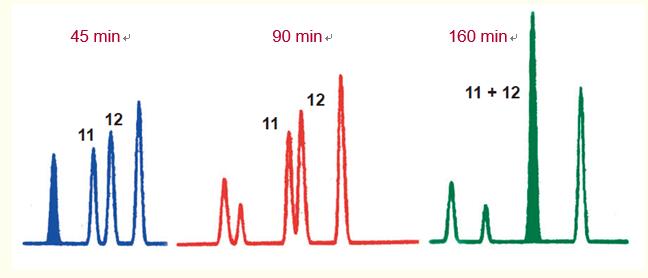 當洗脫時間增加至90分鐘時,多肽11和12間的分辨率降低;而當洗脫時間增加至160分鐘時,出現共洗脫峰。